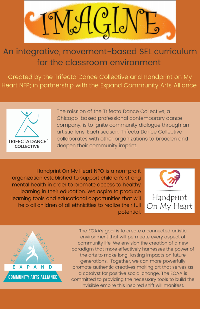In collaboration with Trifecta Dance Collective Youth Company and Expand Community, we are supporting the creation of a Social Emotional Learning (SEL) elementary school curriculum that will foster teaching the calming strategies through a wide variety of the arts! After a pilot residency program in Chicago (when it is safe to return from COVID-19), we hope to make the curriculum available to many others. Look for updates to come!